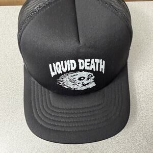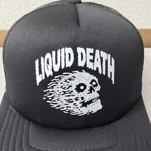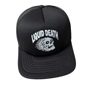 This listing is for a Liquid Death Mesh Trucker Hat. Black/White. Skull logo at the front with LIQUID DEATH text. Snapback. Adjustable.