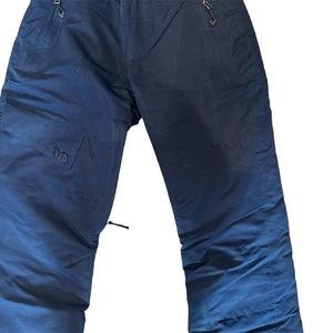 Navy blue snowboard pants. Insulated. Shell 100% Polyester. Lining 100% Polyester. Insulation 100% Polyester. Velcro at the waist. Double button and zipper. Multiple pockets. Used. Has a small stain.
