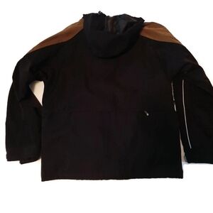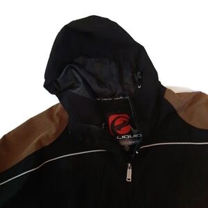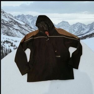 Liquid Boardwear Freerider 2500 MM jacket. Brown accent on sleeves. Attached hood. Measures 32" in length. Interior pockets. Nice preowned condition