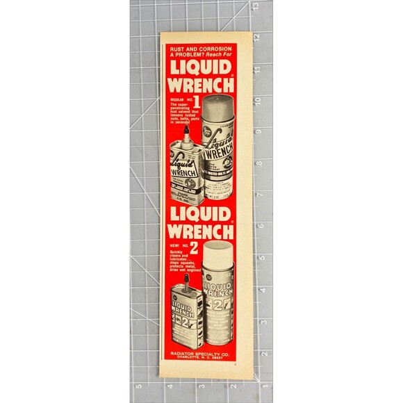 Liquid Wrench Rust & Corrosion Penetrating Solvent, Charlottee, NC. Vintage Print Ad 1975 Car & Driver Magazine November 1975 About 3 x 11 Inches. Carefully shipped.