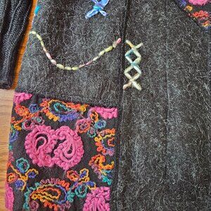 Pre-owned Liquid by Sioni women's longline cardigan. Size Medium. Super artsy piece with so much going on! Different textures, colors, etc. all throughout. Three large black buttons. Really deep pockets as well! In good pre-owned condition. Shows some normal signs of prior wear: small pick in knit fabric on back (visible in Photos #9 and #10).