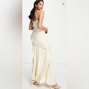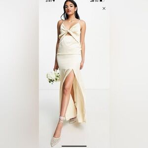 Liquorish Bridesmaid Satin Twist Front Maxi dress with split in champagne size 4