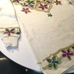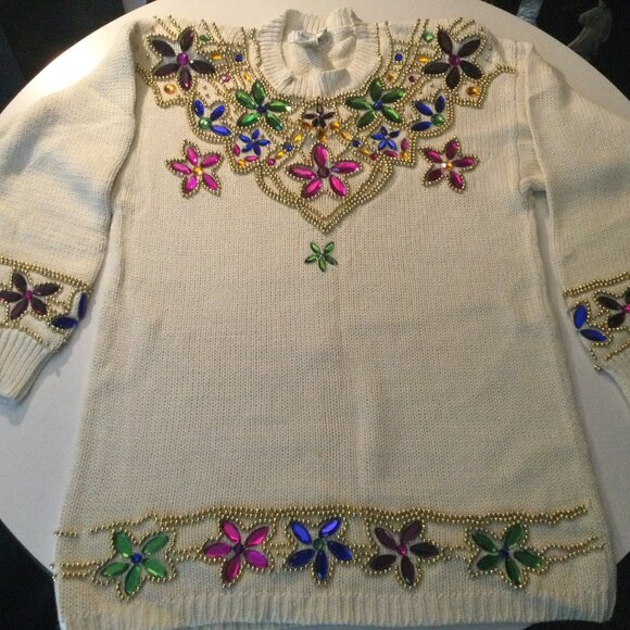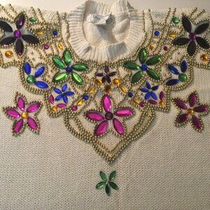 This is a White Sweater that was Factory Beaded Embroidered Bedazzled. In awesome condition. Standard Crew collar. Long sleeve 55% Ramie / 45% Cotton blend. China