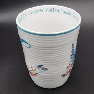 This is a 16-ounce ceramic Lisa Audit mug. The mug is a milky white color with a ribbed texture and a narrow teal ribbon around the top outside rim of the mug. The wording on the inside part of the mug (Cats, Cheese, Chocolate, Crayons, Cotton Candy, Cartoons, Calligraphy, Creamsicles) along the rim is also in teal, as is the calligraphy C on the front and back. The C is adorned with colorful flowers in purple, orange, yellow and blue. It measures approximately 4.75 inches tall and approximately 4 inches across at its mouth. Wording on the bottom indicates that it is dishwasher and microwave safe.
