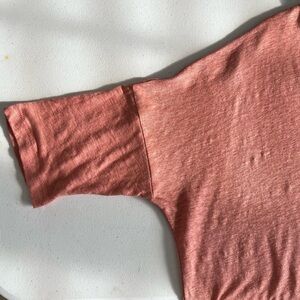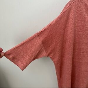 Lisa Bayne 100% Linen V-Neck Dolman Top Minimalist Lightweight Beach Cruise Vacation Boxy Mauve Pink Sz S - in excellent used condition. When laid flat, top measures approximately 28 inches from pit to pit and 29 inches long. Bottom hem is hi-low - back of top is approximately 29 inches.