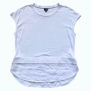 Designer Lisa Bayne cap sleeve women’s top. Baby blue color. Lightweight bamboo, cotton & spandex fabric. Women’s size Small. Elevated casual wardrobe basic.