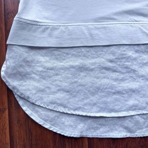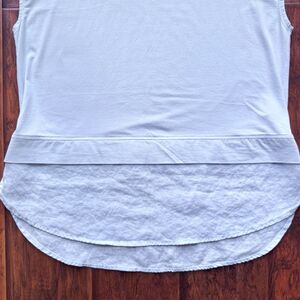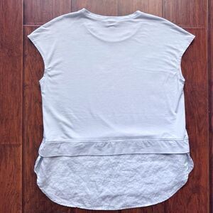 Elevate your wardrobe with this designer Lisa Bayne lagenlook top in size small. Crafted from a soft bamboo-cotton-spandex blend, it features a relaxed, boxy silhouette with a unique layered waist hem and cap sleeves. Effortlessly chic and breathable—perfect for casual days, travel, or creative styling.