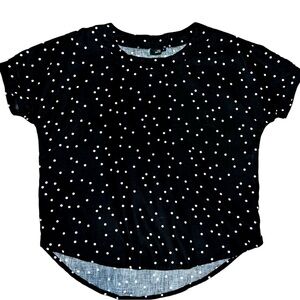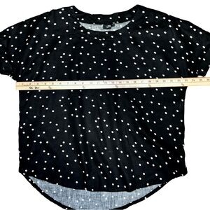 Lisa Bayne 100% linen top black and white polka dots cap sleeves rounded hem for a casual look pre owned great condition like new no rips tears or stains see photos for measurements