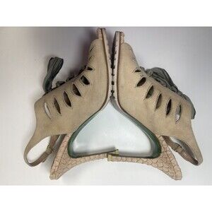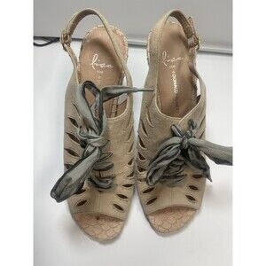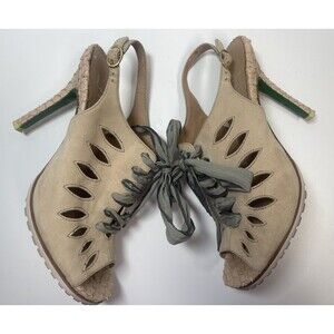Sexy sandals withpeep toe, grosgrain ribbon that cinches a cut out newbuck leather upper with a textured heel. Rubber bottoms with emerald green color effect. Size 9 with a heel height measuring approximately 3 1/2 inches. In excellent preowned condition. Comes from a smoke free home.