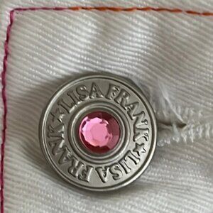 Lisa Frank Vintage Embroidered White Denim Skort/Skirt - Size 7. Excellent pre-owned condition. There are a couple of faint spots, one on the front and one on the back of the skirt, shown in pics. Unsure what it is but it's very hard to see. Zip fly with jeweled and branded button closure. Pearl snap buttons are non functional but adorn the flap cover of the fly. 2 front pockets, 2 back patch pockets, 1 key pocket, back waist patch, rainbow colored embroidery and stitching throughout. 100% cotton and it has attached undershorts in white as well.