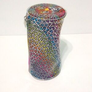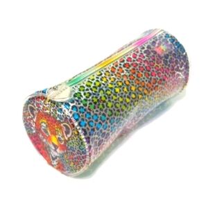 Excellent Condition- Does Not include Brushes Retro Vibe- Lisa Frank X Morphine Neon Leopard Cosmetics Pouch Clear with Neon Leopard Spots and Silver Glitter Shimmer Cylindrical Shape Colorful Zipper Morphie / Lisa Frank zipper pull use as a make up, brushes, pencils, accessories pouch etc. Approximate Measurements 8" X 4"