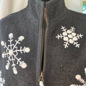 Lisa International Boiled Wool Vest with Embroidered Snowflakes Cute 100% wool black winter vest adorned with embroidered ivory snowflakes. Features a gold zipper closure with white tassel and 2 front patch pockets. Would look nice dressed up or with jeans. 100% Boiled Wool. Photos taken in natural light, please review for condition.
