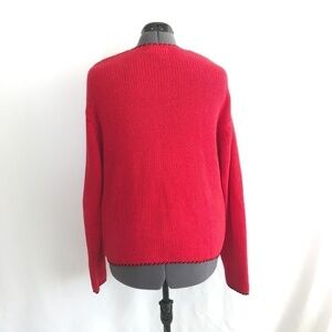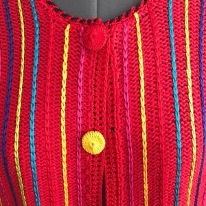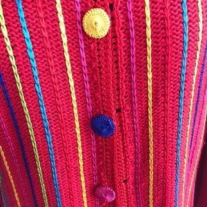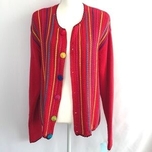Lisa International multi color cardigan with long sleeves. It has different color buttons down the front and vertical colorful knit lines with a solid red back. Gently used...size medium...no flaws noted...See photos for care details.