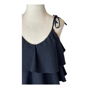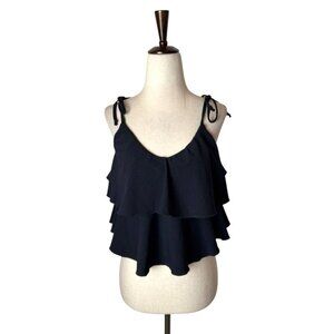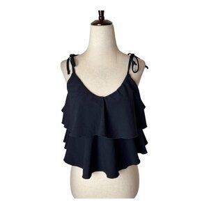 Designed with tiered ruffles and adjustable tie straps, this swim top offers a sophisticated and flattering look while ensuring a secure, comfortable fit.