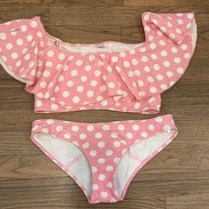 Ruffle shoulder top. Cheeky bottom. Pink and white polka dot. Size 4. NWOT