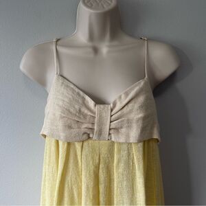 The St. Tropez Dress is a silhouette for this summer. This feminine slip dress has delicate adjustable spaghetti straps and a gathered bust which creates a beautiful shape. This effortless style is color-blocked in natural, yellow, pink, and green Metallic Gauze. Perfect for a summer's day or night. We style this dress with flat sandals. Maxi Length. Fabrication: 92% Linen, 6% Polyamide, 2% Polyester.
