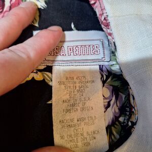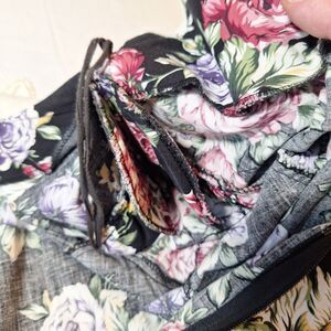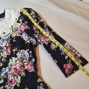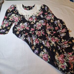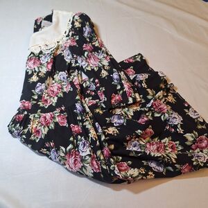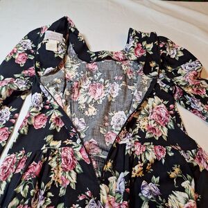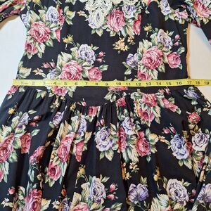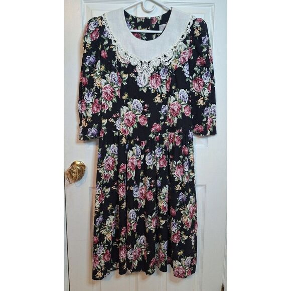 This Lisa Petites Vintage Black and Pink Rose Floral A Line Midi Dress is in excellent used condition. This cottagecore dress is in an A Line midi cut with a lace bib collared neckline. This modest prarie dress has three quarter length puff sleeves and is perfect for church, a costume or a special occasion.