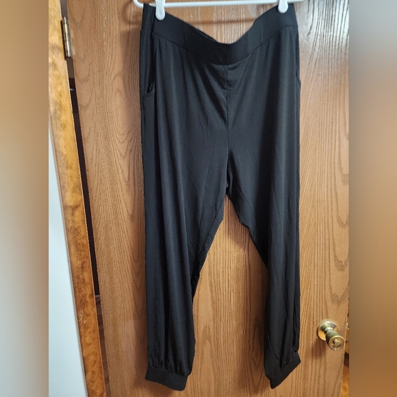 Black dressy joggers with side pockets, pull on style, banded bottom (no elastic) like new worn once. 95% polyester, 5% spandex. Pet & smoke free home