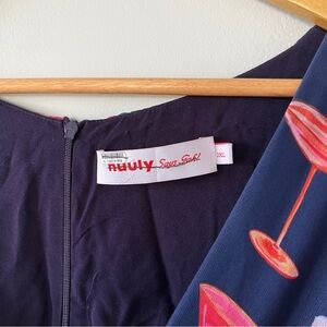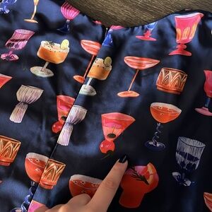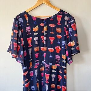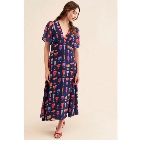 Chic maxi dress with playful cocktail print. Features a deep V-neck and flutter sleeves. Ideal for stylish outings.