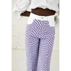 Lisa Says Gah jeans, Robyn pants, wide leg jeans, checkerboard jeans, purple printed denim, high rise jeans, trendy pants, indie style jeans, Y2K aesthetic, statement denim