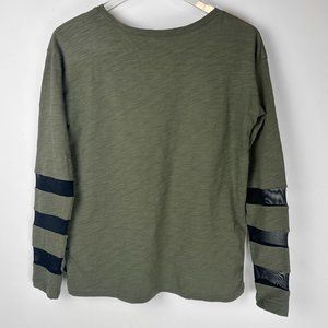 Lisa Todd Mesh Fest Tee Long Sleeve Mesh Striping Green Size XS. Luxury Cotton Blend crew neck t-shirt. Featuring contrast mesh striping at sleeve with a hi-low hem. Relaxed fit.