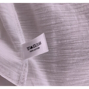 Lisa Todd white v-neck long sleeved tee with an embroidered “blah blah” detail on the bottom side slits which gives a pop of color and sass to this classic tee.