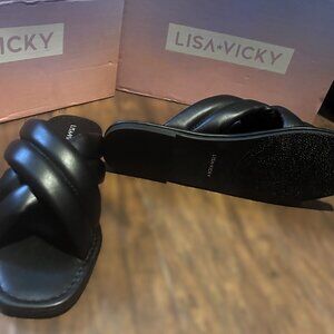 Lisa Vicky "Mentor" sandals in Black Sheep Nappa, size 9.5. Stylish criss-cross puffy straps with cushioned sole- modern, verstatile, and comfortable. Comes in original box and packaging.