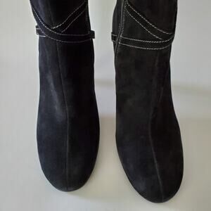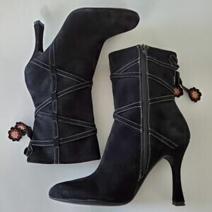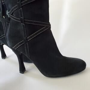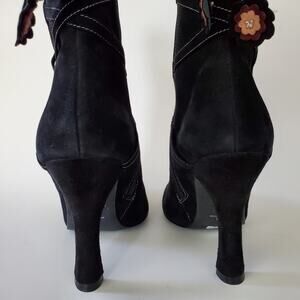 Lisa Vicky black suede Delissa booties, size 7M. Side zipper. Contrasting stitching. Criss-cross suede detailing. Floral detail and bow on the back.