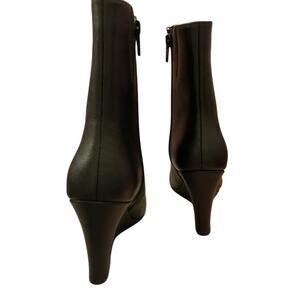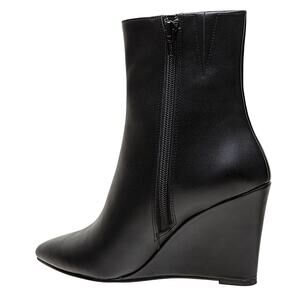 Lisa Vicky Sassy Black Studded Pointed Toe Wedge Bootie, Size 8.5, NWT. Gleaming pyramid studs cascade down the side of a striking leather bootie framed by a pointy toe and wrapped wedge heel. 3.5" heel, 5.5" shaft, cushioned footbed, slip resistant sole, leather upper, textile lining, rubber sole. Zipper side. New with box, retails for $129. #Studded #WedgeHeels #BlackLeather #Edgy #Contemporary
