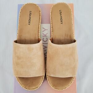 New In Box Lisa Vicky Womens 7M Smile-V Suede Slip on Sandal Tan Camel.