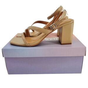 New in Box Lisa Vicky Womens Size 9M VIOLET-V Ankle Strap Sandal Tan Camel Sheep NP. Smooth leather straps sweep across a contemporary-chic sandal lifted by a lofty 3" block heel. Cushioned footbed and slip resistant sole.