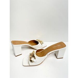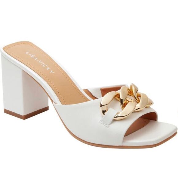 Lisa Vicky Sandals Womens Size 9.5 White Leather Open Toe Heels With Chain