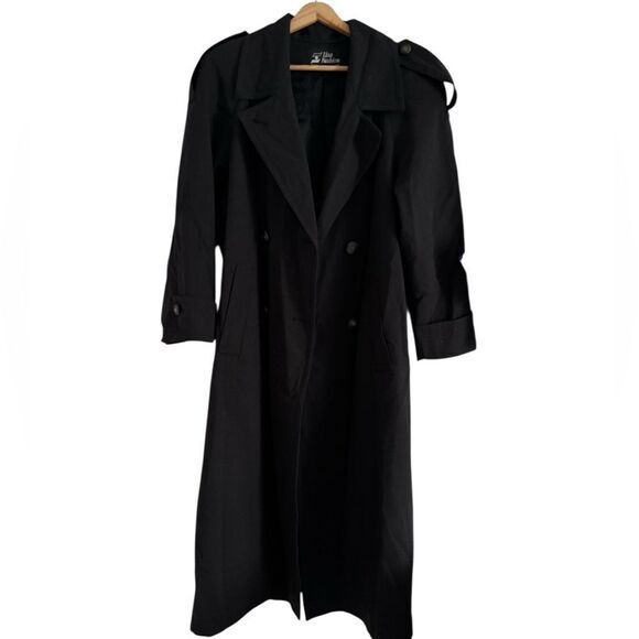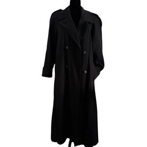 This black trench coat features a full-length design and a classic notched lapel collar, offering a refined and timeless look. Its tailored fit and minimalist style make it ideal for formal occasions.