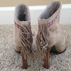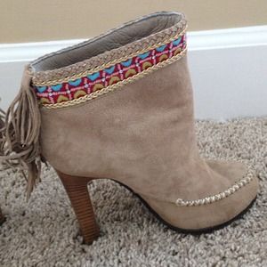 Moccasin fringe stilettos with embroidery. Suede. Made in Italy. Love these!! I couldn't walk in them. Please someone buy with my kinda style :). I'm obsessed and sad to these go but no way I could walk in them. Brand new! Never worn! Orig. 345. I got on sale for 172.50. Still has price sticker. No box(I moved)