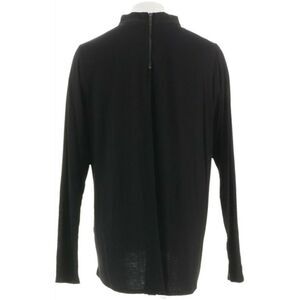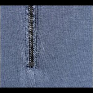 Features: two-ply woven banded neckline, exposed zipper and seam detail at center back, long sleeves, hi-low hem