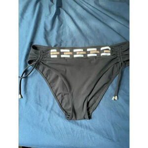 Lise Charmel two piece bikini set. Black base with a white brown threading accent. Bikini bottoms have tassels for accent and bikini top has silver rings accent on the back. Adjustable straps. In excellent condition with no signs of wear. Bottoms are a size medium and top is a size 34, possibly E but unclear if that is the actual cup size.