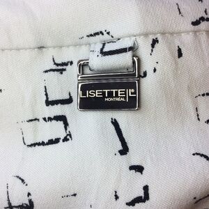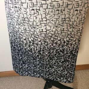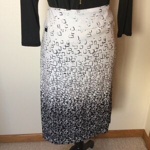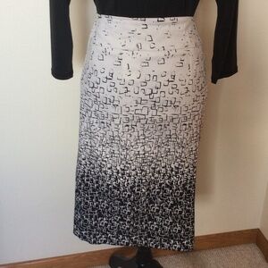 Cute straight skirt with a black & white geo gradient print. Skirt has a wide band waistline, flat front and a side split. Stretch waistline for pull on and off. There is a Lisette silver tone logo charm below the front waistline. Last picture shows an inside mesh elastic front panel for tummy control. Fabric is 77% rayon, 20% nylon and 3% lycra. Approximate measurements: waist 17" across, hips 20" across and length 25" from top of waistband. Skirt is in excellent like new condition.