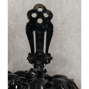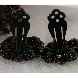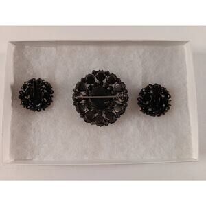 Lisner Black Signed Brooch & Clip On Earrings Set Facet Enamel Stones Metal