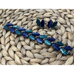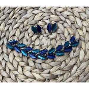 This vintage Lisner jewelry set is perfect for any special occasion, whether it be Mother's Day, Christmas, or an anniversary. The set includes a beautiful green and blue Lucite oak leaf bracelet and matching clip earrings. The color and design of this set make it a unique and stylish addition to any jewelry collection.