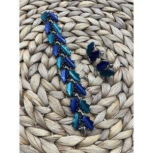 Lisner Green & Blue Lucite Oak Leaf Bracelet & Clip Earrings Silver Tone OS