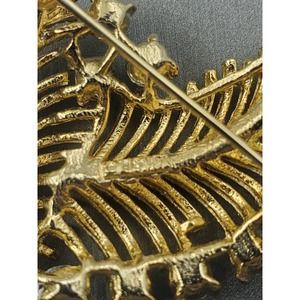 This lovely Lisner set features a textured, polished goldtone, leaf-shape brooch adorned with aurora borealis rhinestones and textured round clip on earrings.