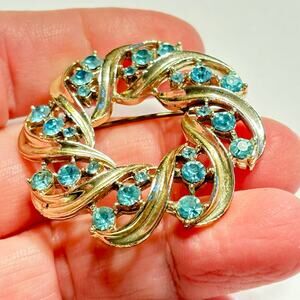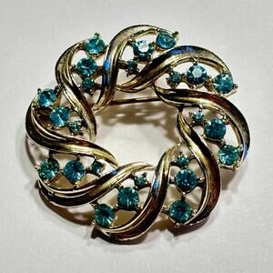 Lisner brooch vintage hallmarked silvertone wreath & blue rhinestones circle pin