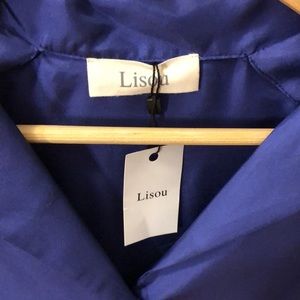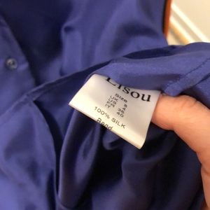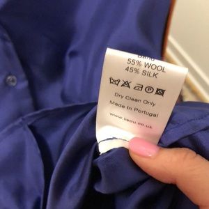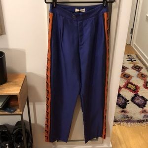 Stylish purple pantsuit with bold orange side stripes. Features a button-up top and high-waisted pants. Perfect for a chic look.
