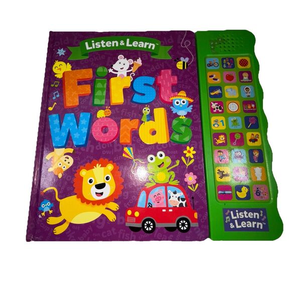 Engage your little one with this interactive Listen & Learn First Words book and electronic sound pad. This set features a colorful board book filled with illustrations and a 27-button sound pad that plays corresponding words and sounds, making learning fun and engaging for toddlers. Perfect for early childhood development and vocabulary building.