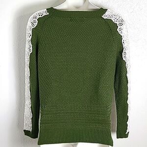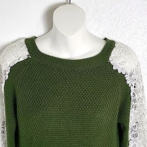 Listicle Army Green Sweater with White Lace Embroidered Longsleeves, Size Small