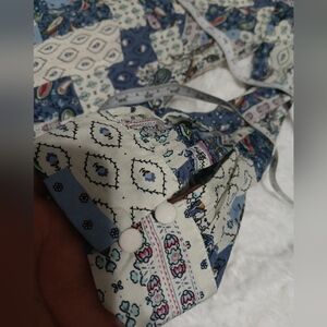Stylish long-sleeve dress with a unique blue and white pattern. Features a tie-neck detail and a flowing silhouette.