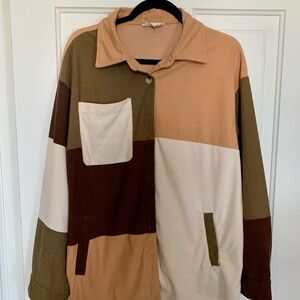 Color-block shacket, which is a type of oversized shirt jacket, featuring an earthy tone palette of brown, tan, olive green, and cream. It includes details like a collar, a front button closure, and a chest pocket