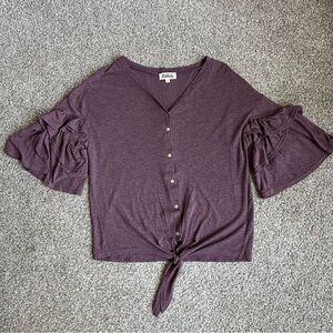Listicle Plum V-Neck Button Up, Front Tie, Ruffle Bell Sleeve Top, Size Small