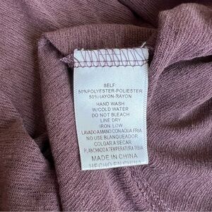 This plum colored top has buttons up the front with a tie at the hem. The sleeves are 3/4 length with a ruffle detail and bell sleeve.