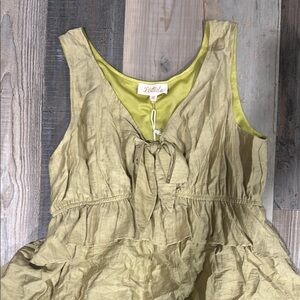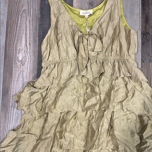 Has a knot tie at bust. Ruffle layers, and high low bottom. The color is a muted lime green color.